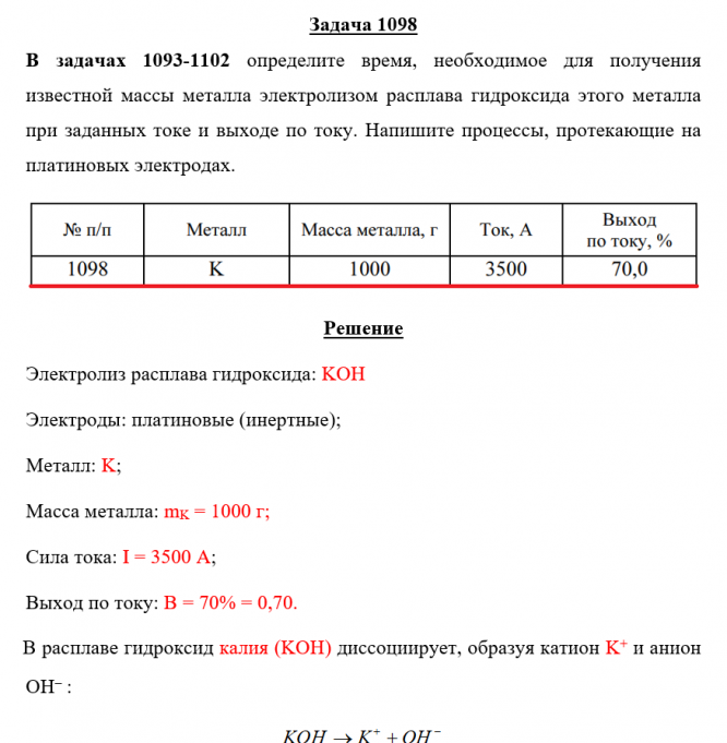 Задача 1098 - определите время, необходимое для получения известной массы металла электролизом расплава гидроксида этого металла при заданных токе и выходе по току. Напишите процессы, протекающие на платиновых электродах.