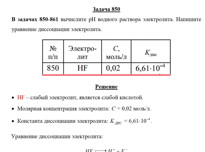 Задача 850: Задача 850 - вычислите pH водного раствора электролита. Напишите уравнение диссоциации электролита.