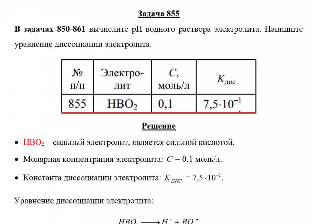 Задача 855: Задача 855 - вычислите pH водного раствора электролита. Напишите уравнение диссоциации электролита.