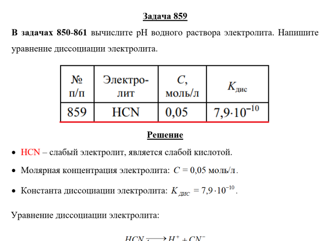 Задача 859: Задача 859 - вычислите pH водного раствора электролита. Напишите уравнение диссоциации электролита.