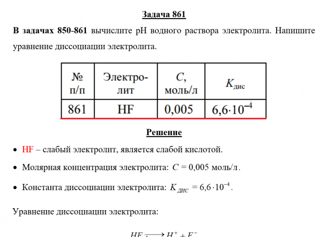 Задача 861: Задача 861 - вычислите pH водного раствора электролита. Напишите уравнение диссоциации электролита.