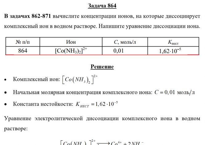 Задача 864 - вычислите концентрации ионов, на которые диссоциирует комплексный ион в водном растворе. Напишите уравнение диссоциации иона.