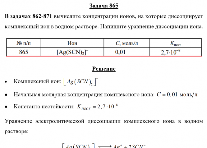 Задача 865 - вычислите концентрации ионов, на которые диссоциирует комплексный ион в водном растворе. Напишите уравнение диссоциации иона.