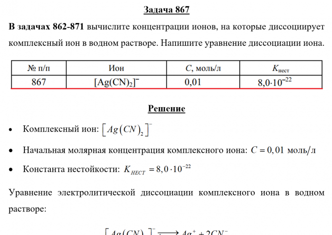 Задача 867 - вычислите концентрации ионов, на которые диссоциирует комплексный ион в водном растворе. Напишите уравнение диссоциации иона.