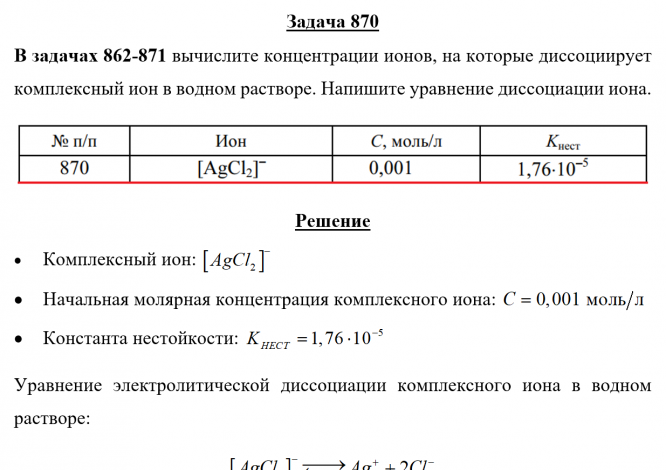 Задача 870 - вычислите концентрации ионов, на которые диссоциирует комплексный ион в водном растворе. Напишите уравнение диссоциации иона.