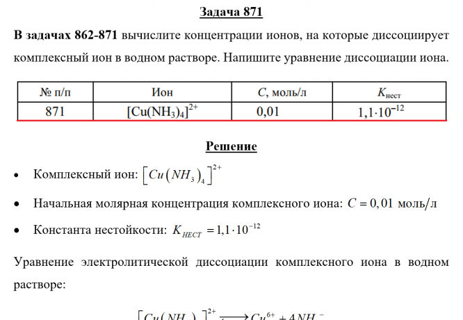 Задача 871 - вычислите концентрации ионов, на которые диссоциирует комплексный ион в водном растворе. Напишите уравнение диссоциации иона.