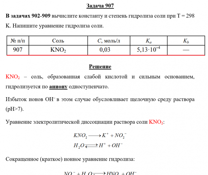 Задача 907: Задача 907 - вычислите константу и степень гидролиза соли при Т = 298 K. Напишите уравнение гидролиза соли.