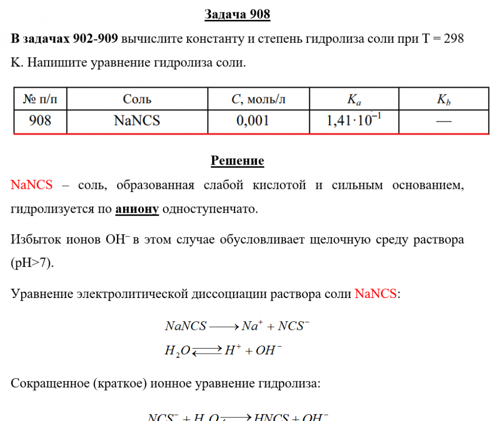 Задача 908: Задача 908 - вычислите константу и степень гидролиза соли при Т = 298 K. Напишите уравнение гидролиза соли.