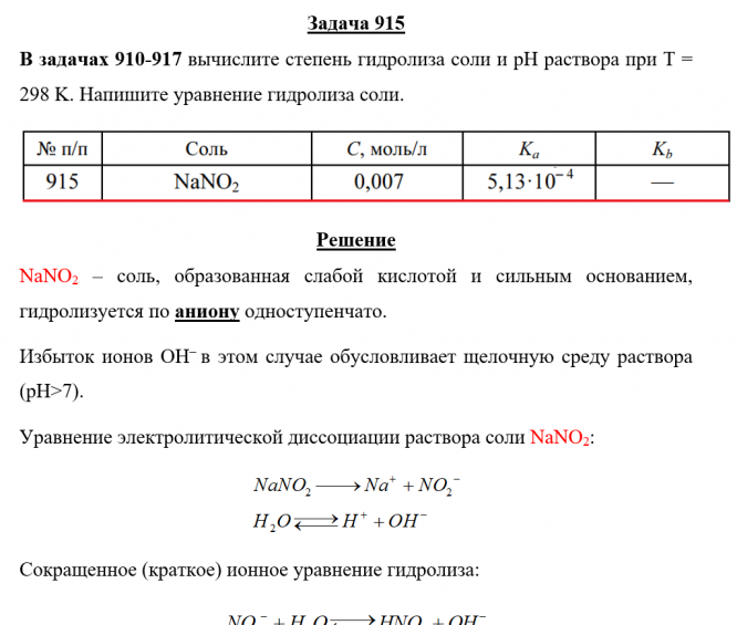 Задача 915: Задача 915 - вычислите степень гидролиза соли и рН раствора при Т = 298 K. Напишите уравнение гидролиза соли.