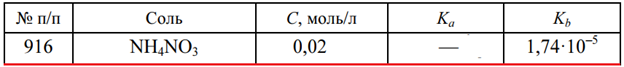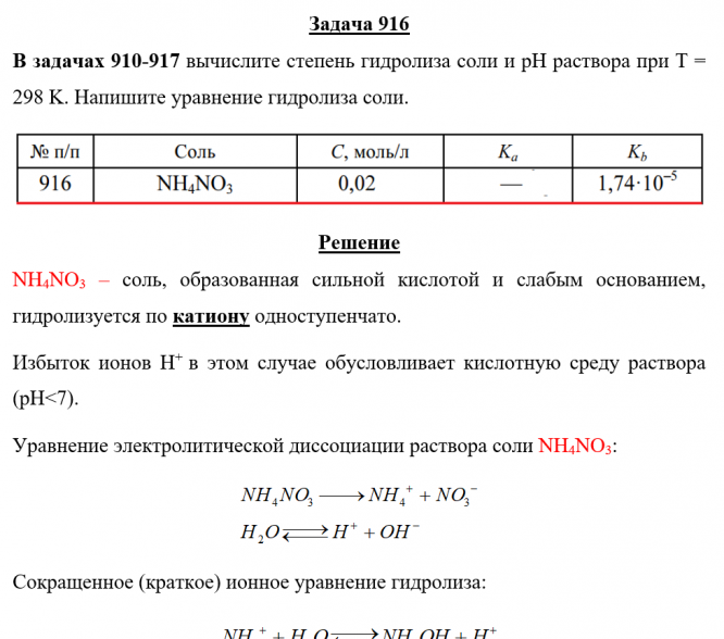 Задача 916: Задача 916 - вычислите степень гидролиза соли и рН раствора при Т = 298 K. Напишите уравнение гидролиза соли.