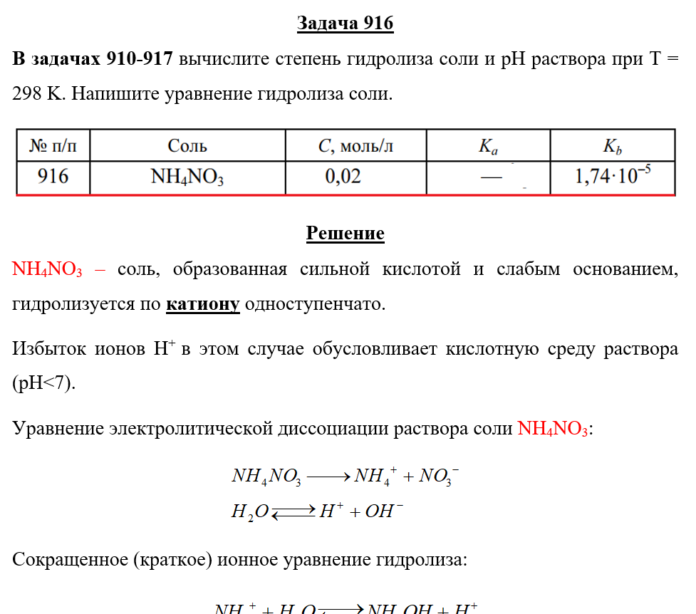 Для студентов по предмету ХимияЗадача 916 - вычислите степень гидролиза соли и рН раствора при Т = 298 K. Напишите уравнение гидролиза соли.Задача 916 - вычислите степень гидролиза соли и рН раствора при Т = 298 K. Напишите уравнение гидролиза соли.