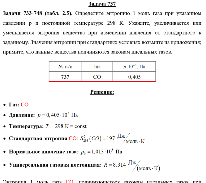 Задачи 733-748 (табл. 2.5). Определите энтропию 1 моль газа при указанном давлении p и постоянной температуре 298 К. Укажите, увеличивается или уменьшается энтропия вещества при изменении давления от стандартного к заданному. Значения энтропии при стандартных условиях возьмите из приложения; примите, что данные вещества подчиняются законам идеальных газов.