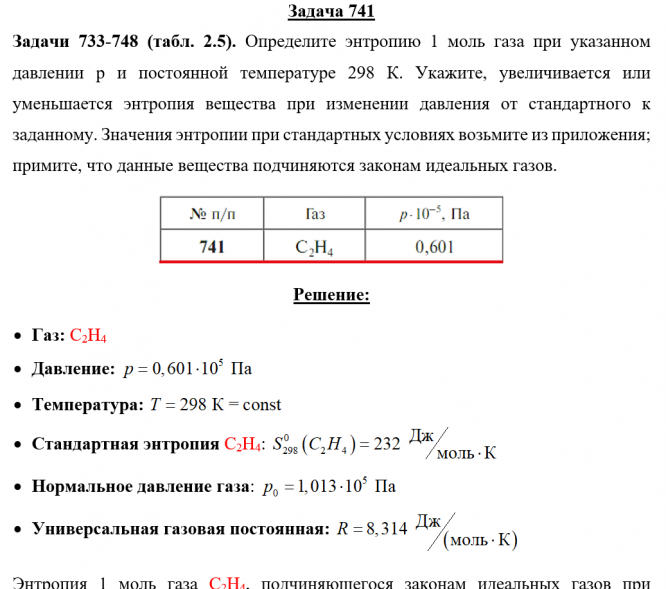 Задачи 733-748 (табл. 2.5). Определите энтропию 1 моль газа при указанном давлении p и постоянной температуре 298 К. Укажите, увеличивается или уменьшается энтропия вещества при изменении давления от стандартного к заданному. Значения энтропии при стандартных условиях возьмите из приложения; примите, что данные вещества подчиняются законам идеальных газов.