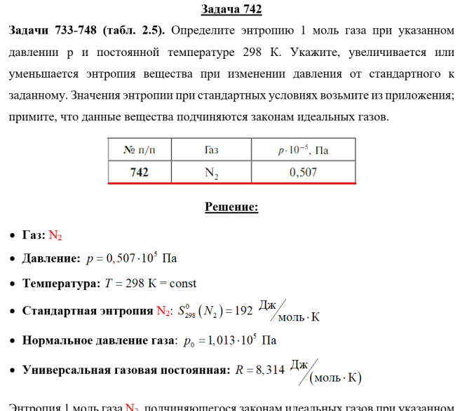 Задачи 733-748 (табл. 2.5). Определите энтропию 1 моль газа при указанном давлении p и постоянной температуре 298 К. Укажите, увеличивается или уменьшается энтропия вещества при изменении давления от стандартного к заданному. Значения энтропии при стандартных условиях возьмите из приложения; примите, что данные вещества подчиняются законам идеальных газов.