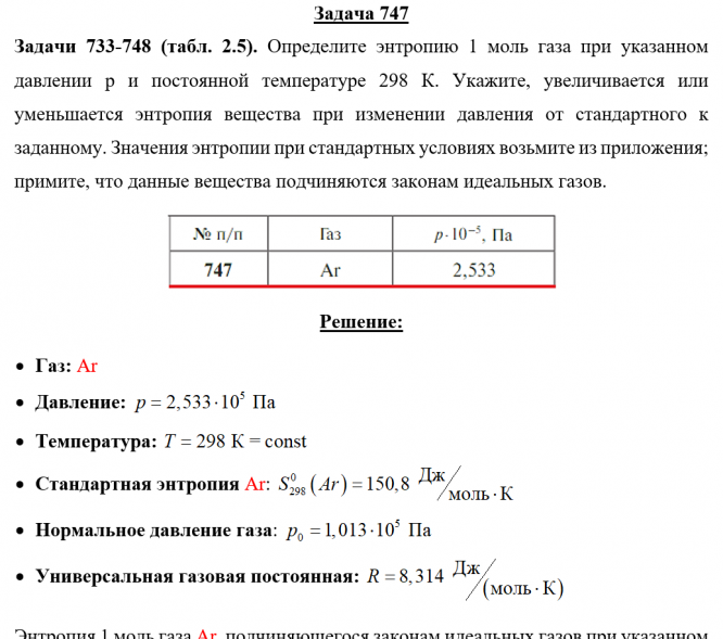 Задачи 733-748 (табл. 2.5). Определите энтропию 1 моль газа при указанном давлении p и постоянной температуре 298 К. Укажите, увеличивается или уменьшается энтропия вещества при изменении давления от стандартного к заданному. Значения энтропии при стандартных условиях возьмите из приложения; примите, что данные вещества подчиняются законам идеальных газов.