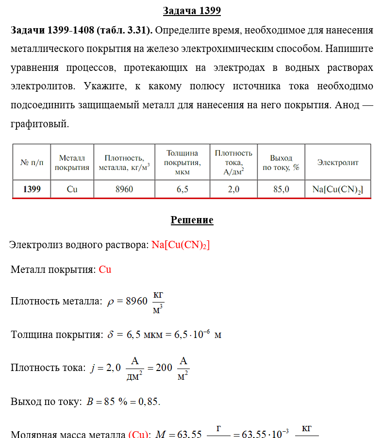Задачи 1399-1408 (табл. 3.31). Определите время, необходимое для нанесения металлического покрытия на железо электрохимическим способом. Напишите уравнения процессов, протекающих на электродах в водных растворах электролитов. Укажите, к какому полюсу источника тока необходимо подсоединить защищаемый металл для нанесения на него покрытия. Анод — графитовый..