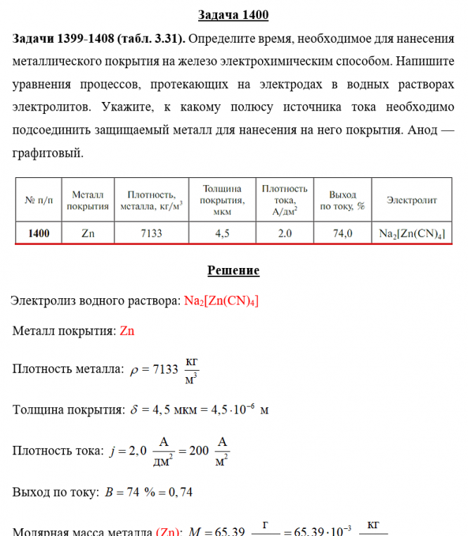 Задачи 1399-1408 (табл. 3.31). Определите время, необходимое для нанесения металлического покрытия на железо электрохимическим способом. Напишите уравнения процессов, протекающих на электродах в водных растворах электролитов. Укажите, к какому полюсу источника тока необходимо подсоединить защищаемый металл для нанесения на него покрытия. Анод — графитовый..