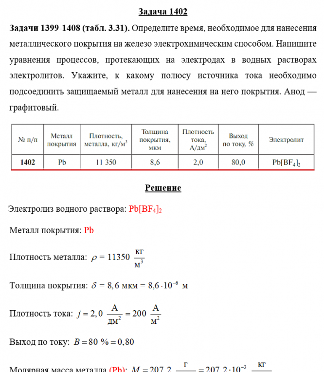 Задачи 1399-1408 (табл. 3.31). Определите время, необходимое для нанесения металлического покрытия на железо электрохимическим способом. Напишите уравнения процессов, протекающих на электродах в водных растворах электролитов. Укажите, к какому полюсу источника тока необходимо подсоединить защищаемый металл для нанесения на него покрытия. Анод — графитовый..