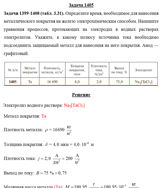 Задачи 1399-1408 (табл. 3.31). Определите время, необходимое для нанесения металлического покрытия на железо электрохимическим способом. Напишите уравнения процессов, протекающих на электродах в водных растворах электролитов. Укажите, к какому полюсу источника тока необходимо подсоединить защищаемый металл для нанесения на него покрытия. Анод — графитовый..