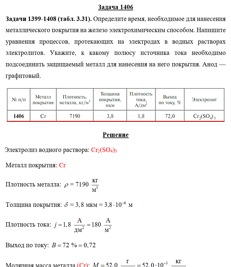 Задачи 1399-1408 (табл. 3.31). Определите время, необходимое для нанесения металлического покрытия на железо электрохимическим способом. Напишите уравнения процессов, протекающих на электродах в водных растворах электролитов. Укажите, к какому полюсу источника тока необходимо подсоединить защищаемый металл для нанесения на него покрытия. Анод — графитовый.