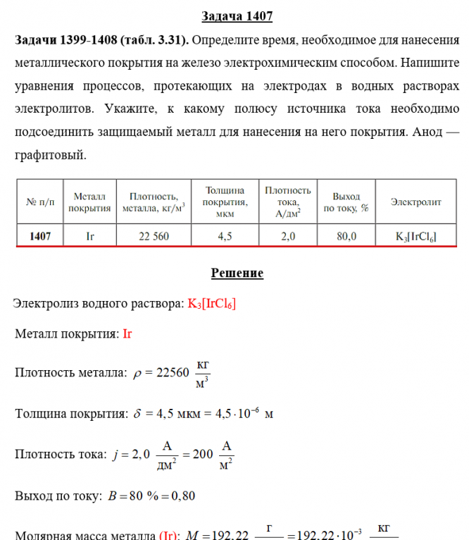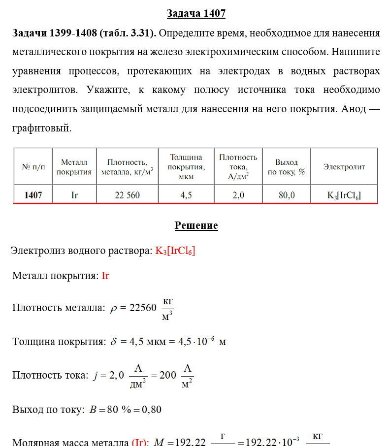 Задачи 1399-1408 (табл. 3.31). Определите время, необходимое для нанесения металлического покрытия на железо электрохимическим способом. Напишите уравнения процессов, протекающих на электродах в водных растворах электролитов. Укажите, к какому полюсу источника тока необходимо подсоединить защищаемый металл для нанесения на него покрытия. Анод — графитовый.