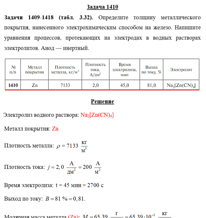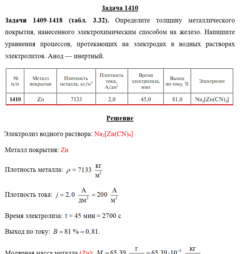 Задачи 1409-1418 (табл. 3.32). Определите толщину металлического покрытия, нанесенного электрохимическим способом на железо. Напишите уравнения процессов, протекающих на электродах в водных растворах электролитов. Анод — инертный..