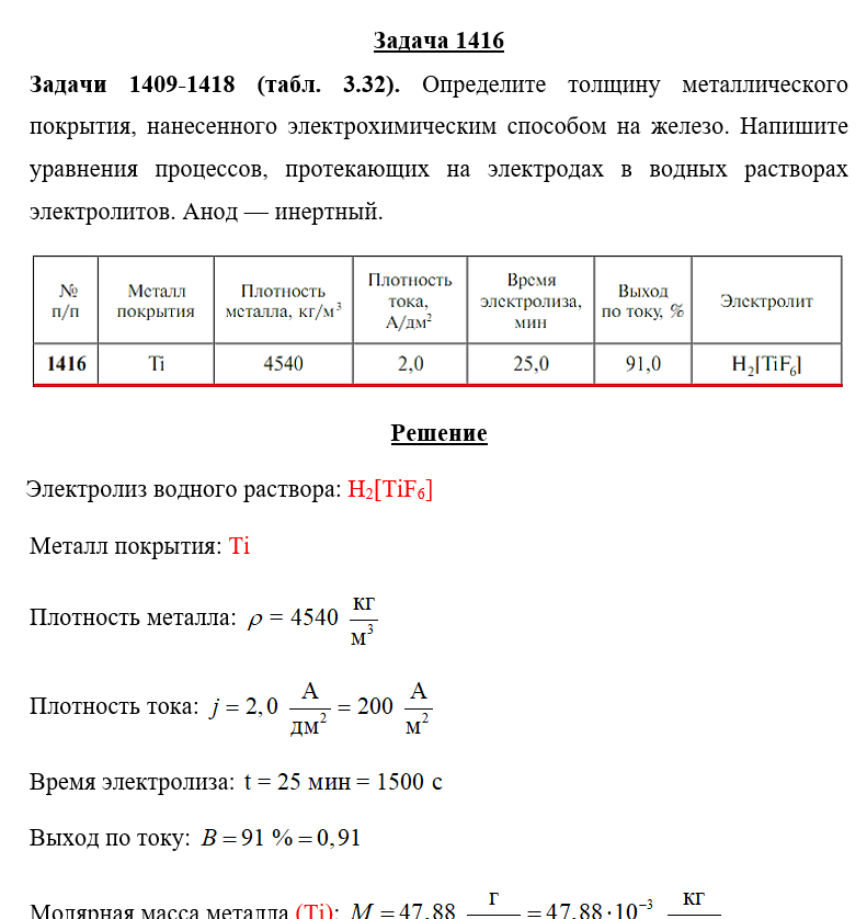 Задачи 1409-1418 (табл. 3.32). Определите толщину металлического покрытия, нанесенного электрохимическим способом на железо. Напишите уравнения процессов, протекающих на электродах в водных растворах электролитов. Анод — инертный..