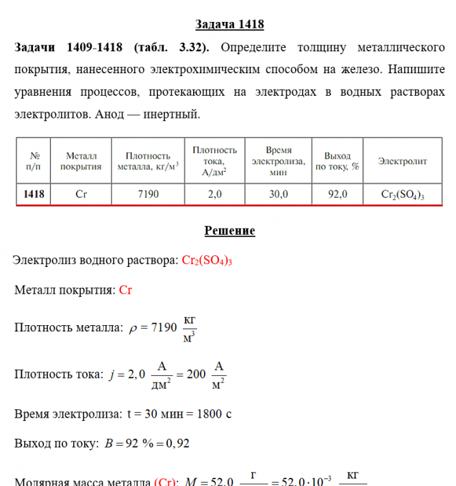 Задача 1418 - Определите толщину металлического покрытия, нанесенного электрохимическим способом на железо. Напишите уравнения процессов, протекающих на электродах в водных растворах электролитов. Анод — инертный.