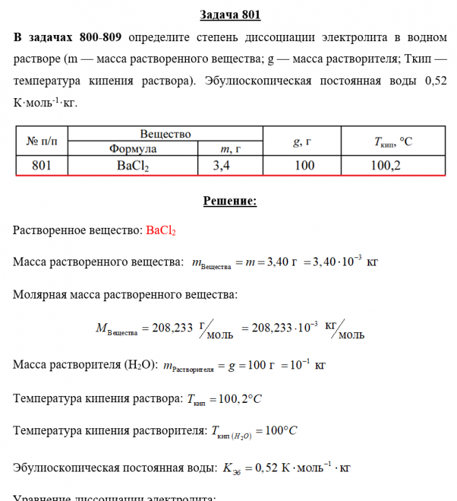 Задача 801 - определите степень диссоциации электролита в водном растворе (m — масса растворенного вещества; g — масса растворителя; Ткип — температура кипения раствора). Эбулиоскопическая постоянная воды 0,52 K·моль-1·л.