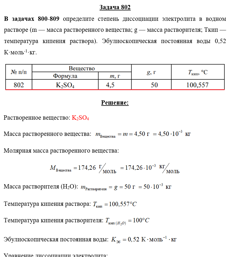 Задача 802 - определите степень диссоциации электролита в водном растворе (m — масса растворенного вещества; g — масса растворителя; Ткип — температура кипения раствора). Эбулиоскопическая постоянная воды 0,52 K·моль-1·л.