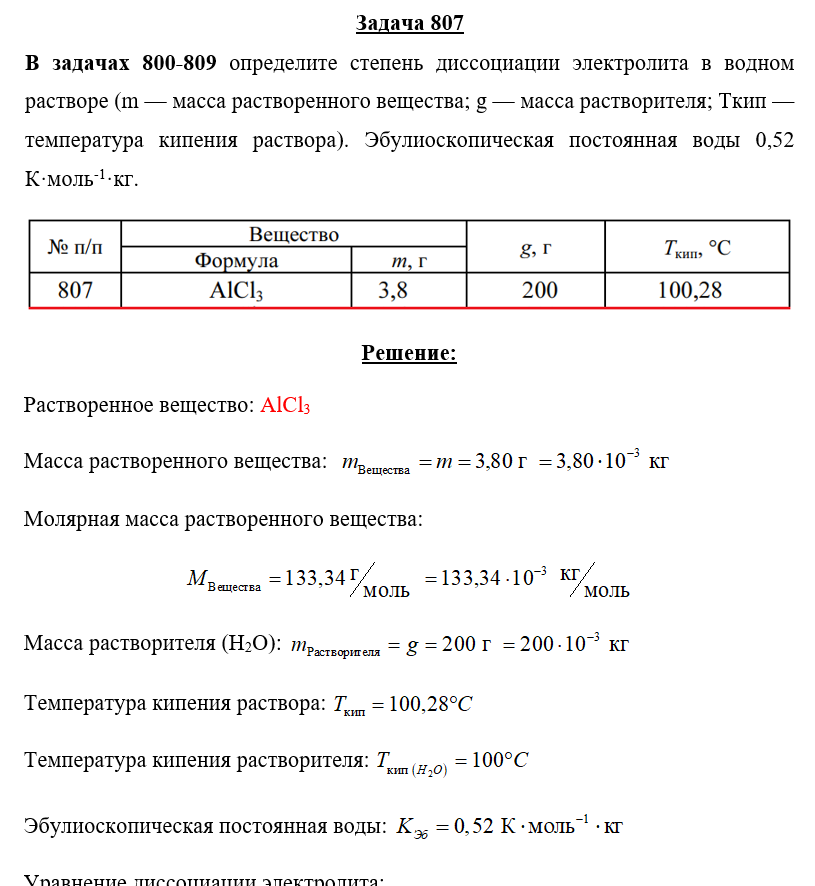 Задача 807 - определите степень диссоциации электролита в водном растворе (m — масса растворенного вещества; g — масса растворителя; Ткип — температура кипения раствора). Эбулиоскопическая постоянная воды 0,52 K·моль-1·л.