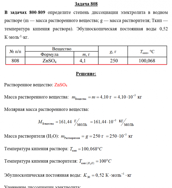 Задача 808 - определите степень диссоциации электролита в водном растворе (m — масса растворенного вещества; g — масса растворителя; Ткип — температура кипения раствора). Эбулиоскопическая постоянная воды 0,52 K·моль-1·л.