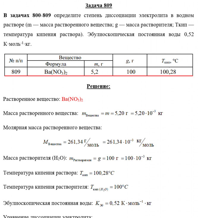 Задача 809 - определите степень диссоциации электролита в водном растворе (m — масса растворенного вещества; g — масса растворителя; Ткип — температура кипения раствора). Эбулиоскопическая постоянная воды 0,52 K·моль-1·л.