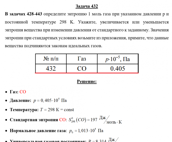 Задача 432 - определите энтропию 1 моль газа при указанном давлении p и постоянной температуре 298 K. Укажите, увеличивается или уменьшается энтропия вещества при изменении давления от стандартного к заданному. Значения энтропии при стандартных услов