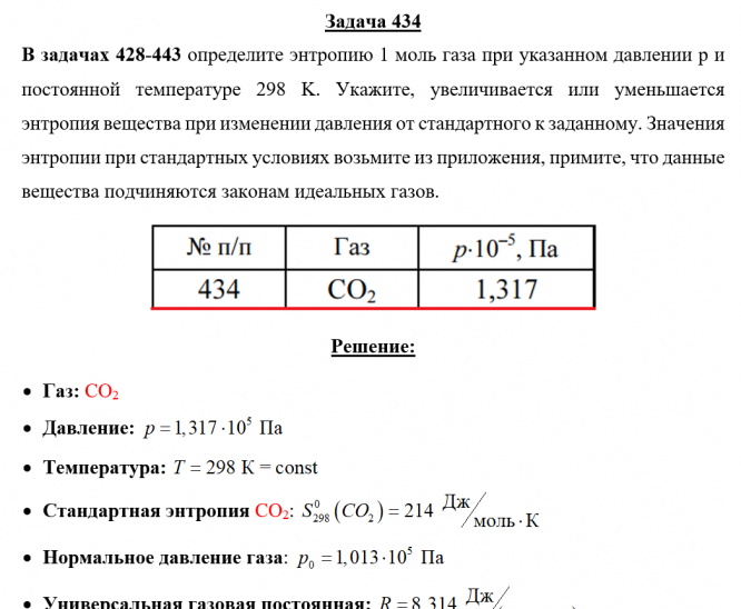 Задача 434 - определите энтропию 1 моль газа при указанном давлении p и постоянной температуре 298 K. Укажите, увеличивается или уменьшается энтропия вещества при изменении давления от стандартного к заданному. Значения энтропии при стандартных услов