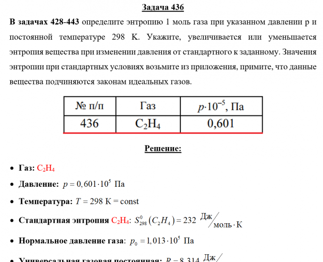Задача 436 - определите энтропию 1 моль газа при указанном давлении p и постоянной температуре 298 K. Укажите, увеличивается или уменьшается энтропия вещества при изменении давления от стандартного к заданному. Значения энтропии при стандартных услов
