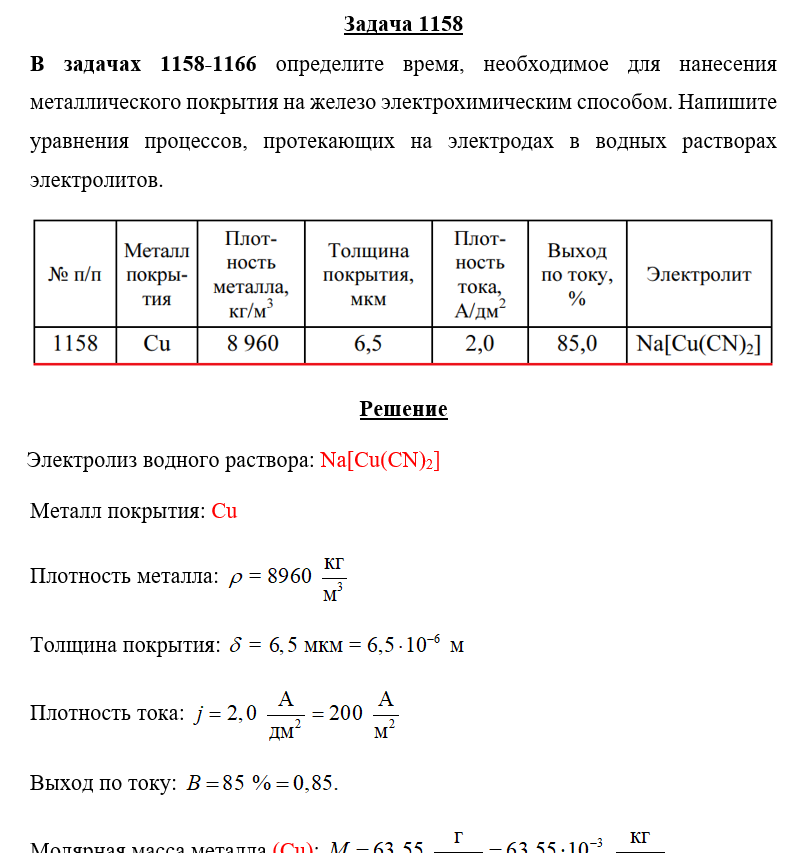 Задача 1158 - определите время, необходимое для нанесения металлического покрытия на железо электрохимическим способом. Напишите уравнения процессов, протекающих на электродах в водных растворах электролитов.