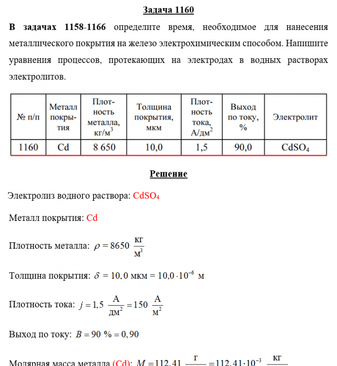 Задача 1160 - определите время, необходимое для нанесения металлического покрытия на железо электрохимическим способом. Напишите уравнения процессов, протекающих на электродах в водных растворах электролитов.