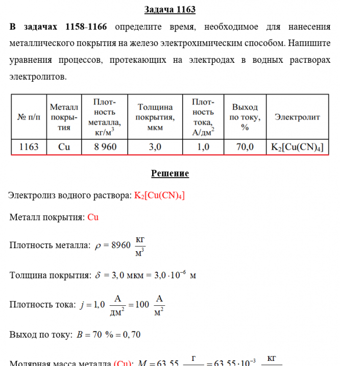 Задача 1163 - определите время, необходимое для нанесения металлического покрытия на железо электрохимическим способом. Напишите уравнения процессов, протекающих на электродах в водных растворах электролитов.