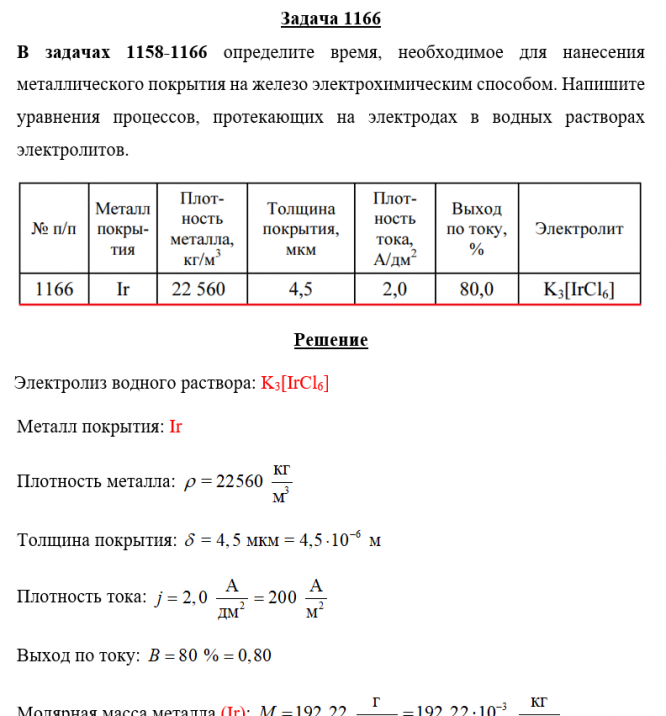 Задача 1166 - определите время, необходимое для нанесения металлического покрытия на железо электрохимическим способом. Напишите уравнения процессов, протекающих на электродах в водных растворах электролитов.