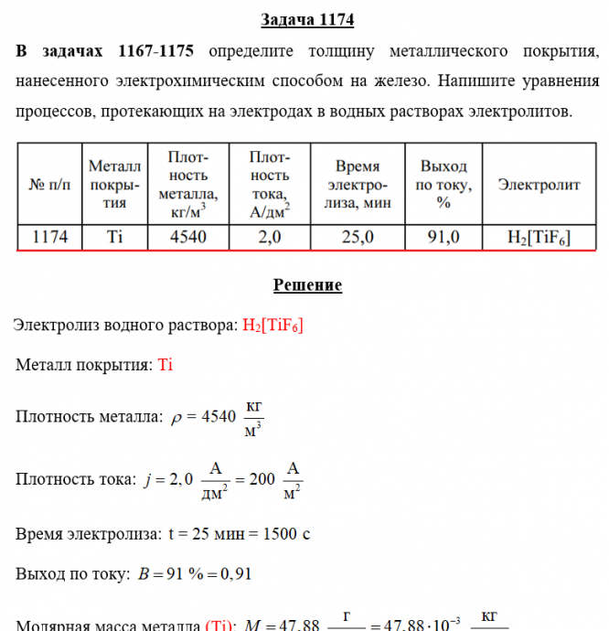 Задача 1174 - определите толщину металлического покрытия, нанесенного электрохимическим способом на железо. Напишите уравнения процессов, протекающих на электродах в водных растворах электролитов.