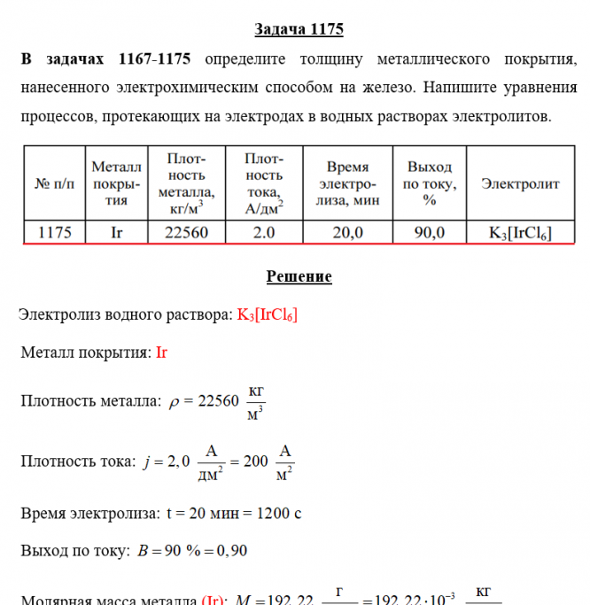 Задача 1175 - определите толщину металлического покрытия, нанесенного электрохимическим способом на железо. Напишите уравнения процессов, протекающих на электродах в водных растворах электролитов.