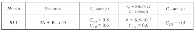 Задачи 906-915 (табл. 2.14). Для условной элементарной реакции рассчитайте скорость реакции r2 при указанной концентрации С2 одного из компонентов, если известны начальные концентрации реагентов С0 и скорость реакции r1 при определенной концентрации одного из компонентов С1. .