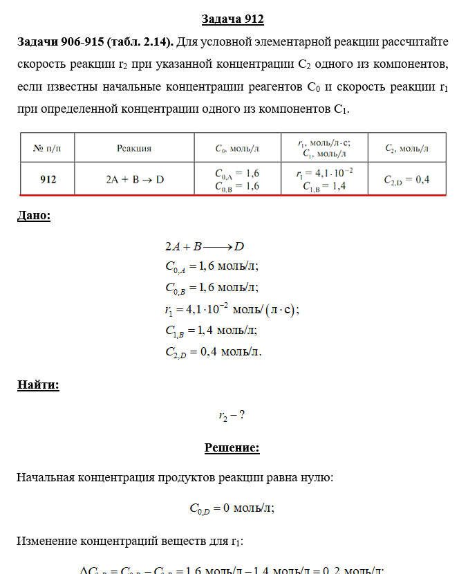 Главная » Учебные материалы » Химия » Решения задач » Несколько классов/семестров » Номер 912 » Задача 912 - Для условной элементарной реакции рассчитайте скорость реакции r2 при указанной концентрации С2 одного из компонентов, если известны начальные концентрации реагентов С0 и скорость реакции r1 при определенной концентрации одного из компон