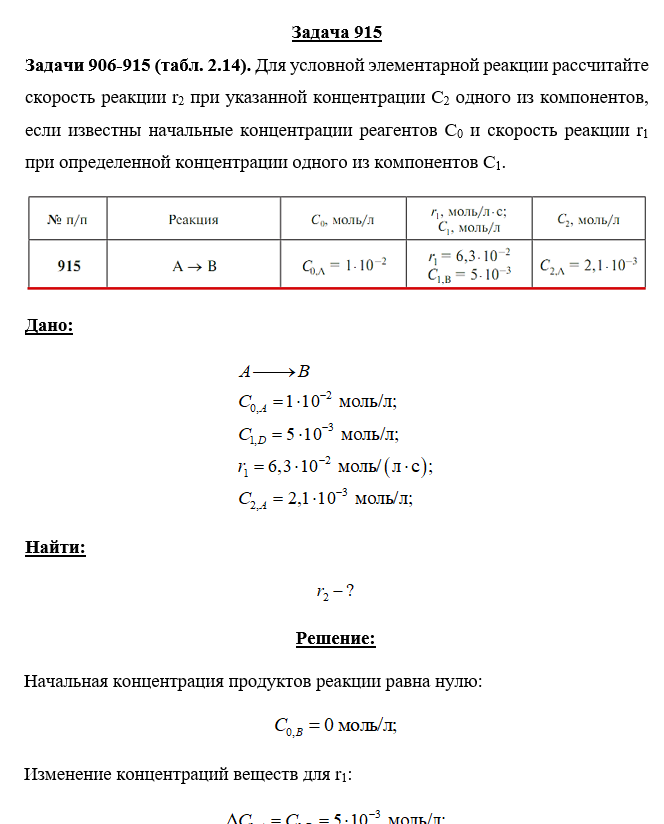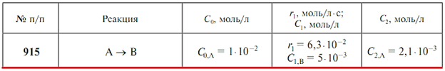 Задачи 906-915 (табл. 2.14). Для условной элементарной реакции рассчитайте скорость реакции r2 при указанной концентрации С2 одного из компонентов, если известны начальные концентрации реагентов С0 и скорость реакции r1 при определенной концентрации одного из компонентов С1. .