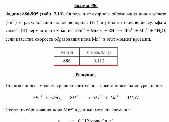 Задачи 886-905 (табл. 2.13). Определите скорость образования ионов железа (Fe3+) и расходования ионов водорода (H+) в реакции окисления сульфата железа (II) перманганатом калия: 5Fe2+ + MnO4- + 8H+ → 5Fe3+ + Mn2+ + 4H2O, если известна скорость образования иона Mn2+ в этот момент времени.