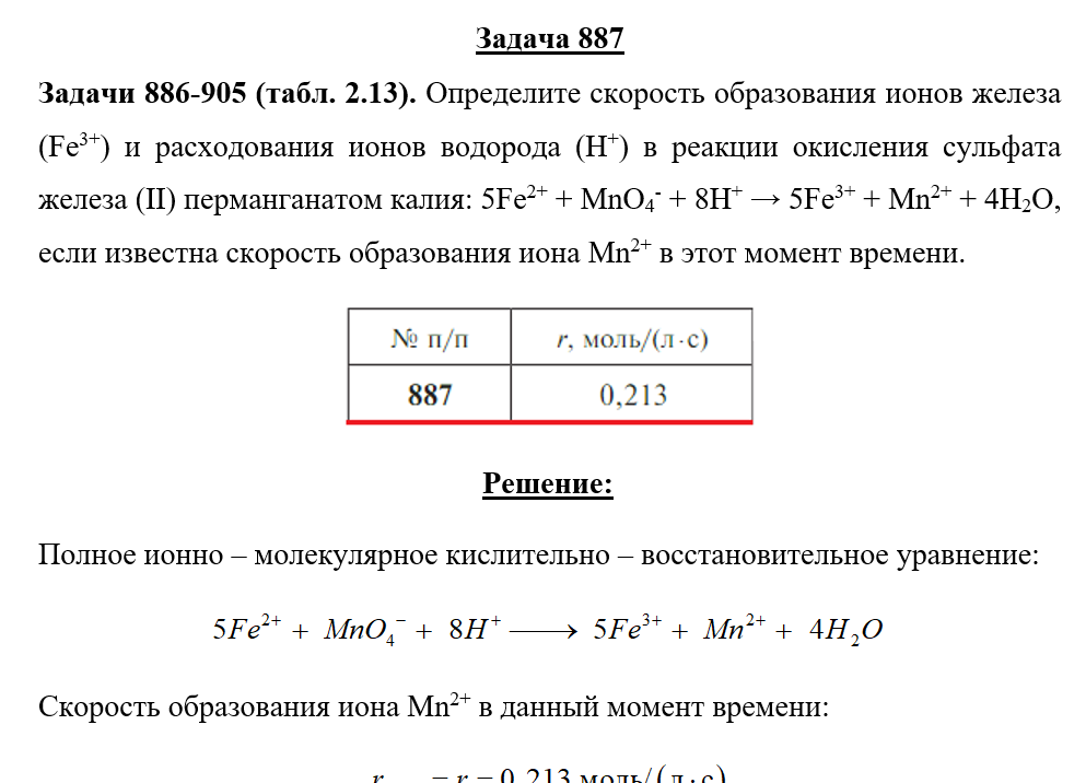 Задачи 886-905 (табл. 2.13). Определите скорость образования ионов железа (Fe3+) и расходования ионов водорода (H+) в реакции окисления сульфата железа (II) перманганатом калия: 5Fe2+ + MnO4- + 8H+ → 5Fe3+ + Mn2+ + 4H2O, если известна скорость образования иона Mn2+ в этот момент времени.