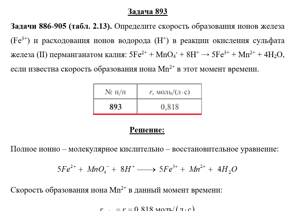 Задачи 886-905 (табл. 2.13). Определите скорость образования ионов железа (Fe3+) и расходования ионов водорода (H+) в реакции окисления сульфата железа (II) перманганатом калия: 5Fe2+ + MnO4- + 8H+ → 5Fe3+ + Mn2+ + 4H2O, если известна скорость образования иона Mn2+ в этот момент времени.