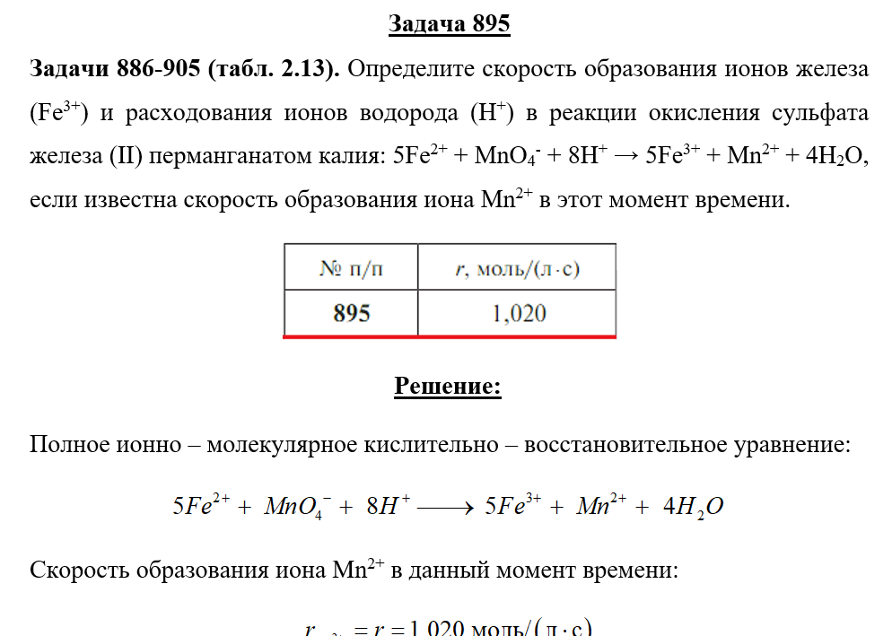 Задачи 886-905 (табл. 2.13). Определите скорость образования ионов железа (Fe3+) и расходования ионов водорода (H+) в реакции окисления сульфата железа (II) перманганатом калия: 5Fe2+ + MnO4- + 8H+ → 5Fe3+ + Mn2+ + 4H2O, если известна скорость образования иона Mn2+ в этот момент времени.