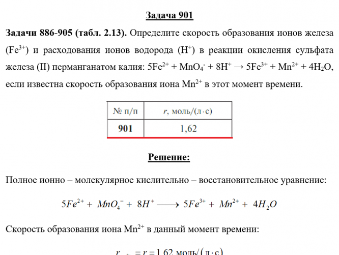 Задачи 886-905 (табл. 2.13). Определите скорость образования ионов железа (Fe3+) и расходования ионов водорода (H+) в реакции окисления сульфата железа (II) перманганатом калия: 5Fe2+ + MnO4- + 8H+ → 5Fe3+ + Mn2+ + 4H2O, если известна скорость образования иона Mn2+ в этот момент времени.